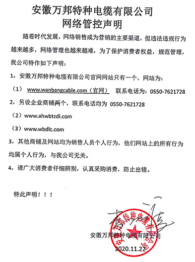 鄭重聲明:安徽萬邦特種電纜有限公司官方網站為:www_wanbangcable_com.kswdf.com,除此之外無任何子網站或合作網站,其余均為假冒偽劣。電話:0550-7621728 13485756353 地 址:安徽省天長市滁州高新技術產業開發區經四路29號